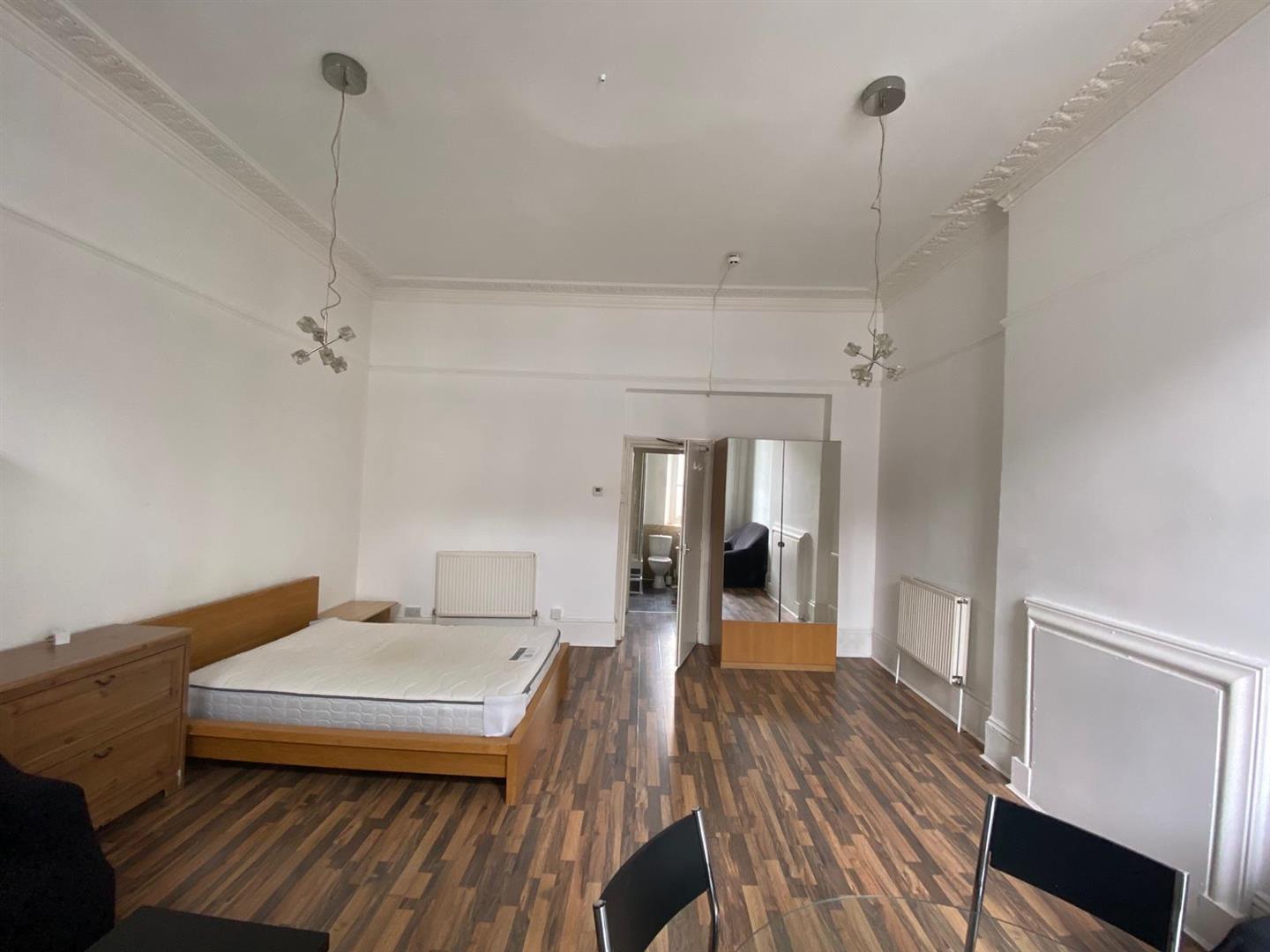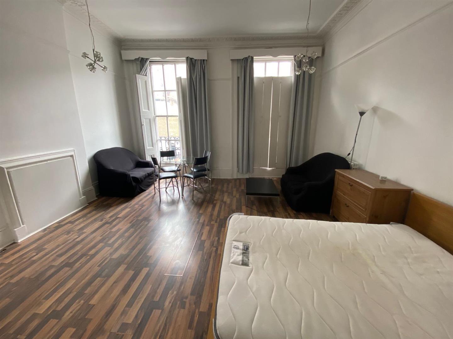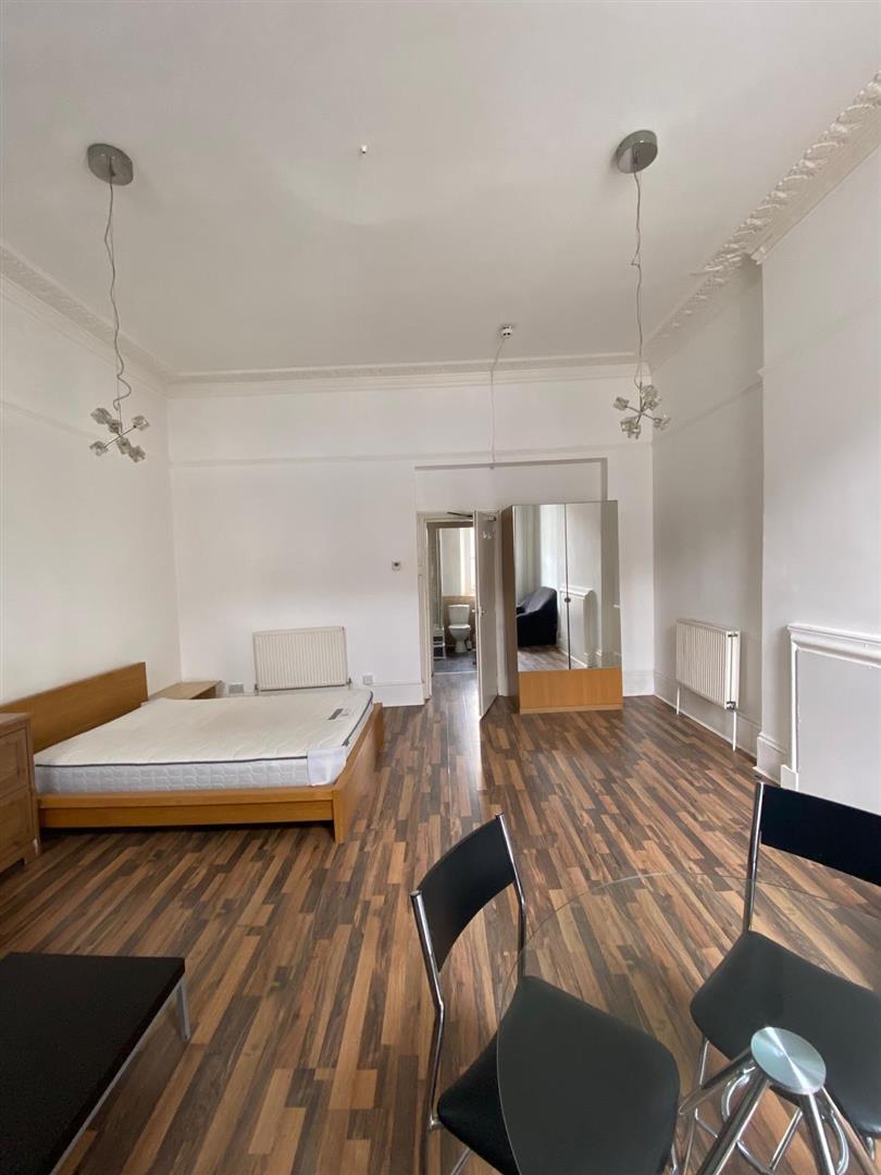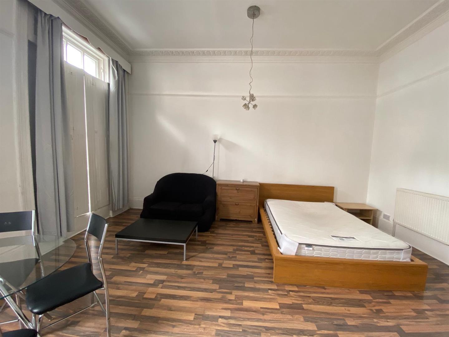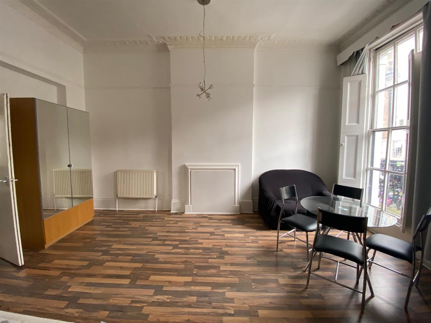 The property boasts a large studio room with lots of space amd high ceilings, wooden floors and beautiful big windows that access a small private balcony, the studio flat has a separate fully fitted kitchen and a good size bathroom, and it's offered furnished.